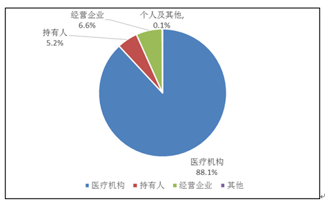 持有人、經(jīng)營企業(yè)和醫(yī)療機構(gòu)是藥品不良反應(yīng)報告的責(zé)任單位。按照報告來源統(tǒng)計,2019年來自醫(yī)療機構(gòu)的報告占88.1%;來自經(jīng)營企業(yè)的報告占6.6%;來自持有人的報告占5.2%;來自個人及其他報告者的報告占0.1%(圖3)。