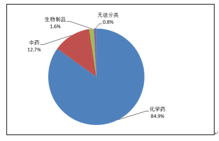 按照藥品類別統(tǒng)計,化學(xué)藥品占86.6%,中藥占12.6%,生物制品占0.8%?;瘜W(xué)藥品排名居前的藥品類別是抗感染藥、心血管系統(tǒng)用藥、腫瘤用藥、神經(jīng)系統(tǒng)用藥、電解質(zhì)、酸堿平衡及營養(yǎng)藥;中藥排名居前的藥品類別是理血劑、補益劑、祛濕劑、開竅劑、清熱劑。