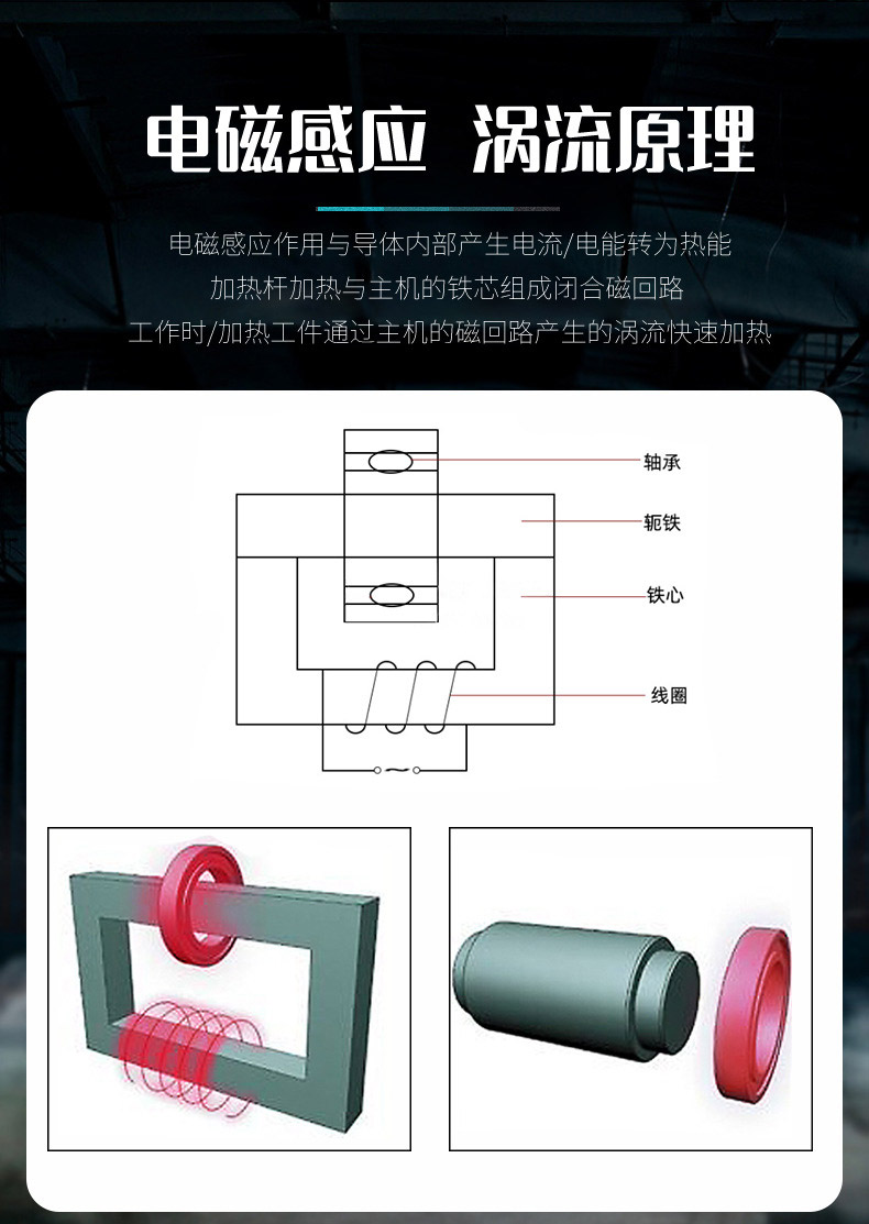 4、被加熱工件放置到主機鐵蕊中間活動軛鐵的下面,輕輕向下移動,使之與工件吻合(若工件厚度尺寸不變,可調(diào)節(jié)主機后杠桿橋下面的定位螺釘,使軛鐵與工件保持2mm的間距,以方便連續(xù)操作)。至此,調(diào)試結(jié)束,可投入使用。