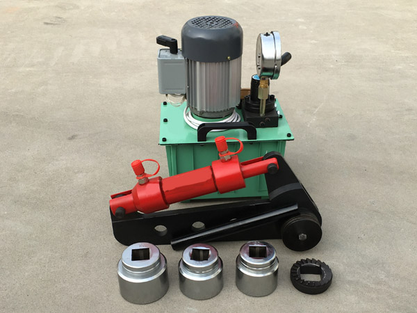手動(dòng)高壓泵由操縱手柄,高壓泵、換向閥、油箱、壓力表和帶快速接頭的輸油管等組成。帶棘輪式液壓扳手由高壓油口、液壓油缸、曲柄、反力桿、棘輪裝置、套筒等組成、前者系動(dòng)力源部件,后者為扭矩執(zhí)行機(jī)構(gòu)。